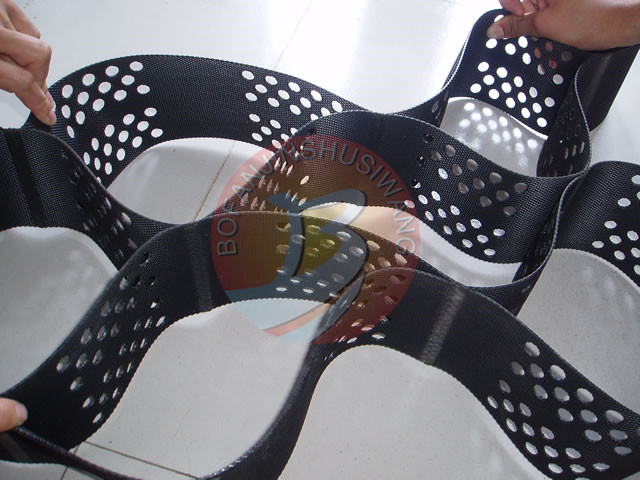 蜂巢土工格室是一種新型土工合成材料,是以高分子聚合物片材,經(jīng)超聲波焊接而成具有三維網(wǎng)狀立體結(jié)構(gòu)的格室。使用時(shí)展開呈網(wǎng)絡(luò)狀,填入沙子碎石及泥土等松散料形成一種整體機(jī)構(gòu)的組合材料??筛鶕?jù)客戶要求在片材上蜂巢或印花,以增強(qiáng)其側(cè)向透水能力,加大與地基材料的摩擦力和結(jié)合力。